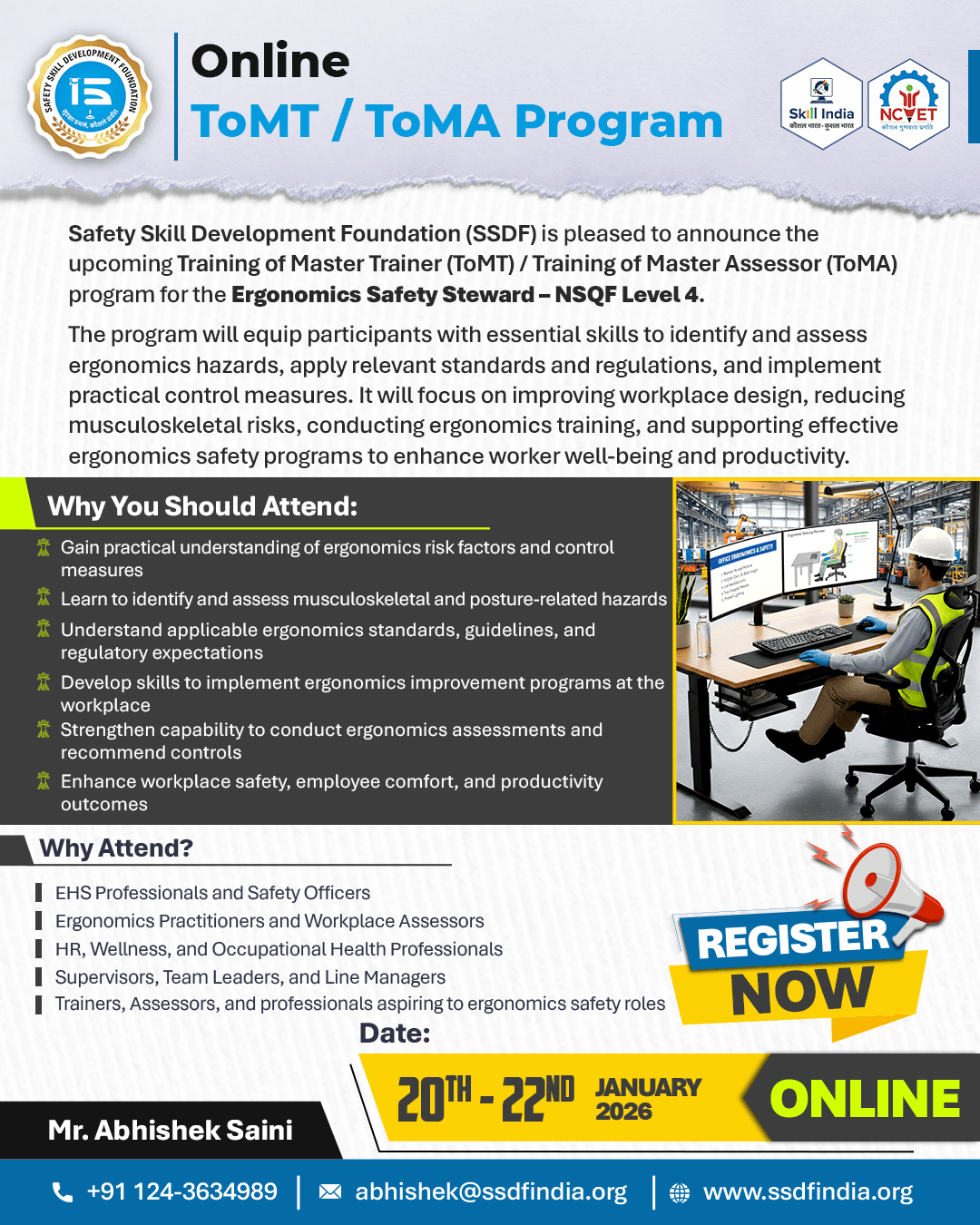 The Safety Skill Development Foundation (SSDF) is pleased to announce an upcoming Training of Master Trainers / Training of Master Assessors (ToMT/ToMA) program for the job role of Ergonomics Safety Steward, mapped to NSQF Level 4.The program will equip participants with essential skills to identify and assess ergonomics hazards, apply relevant standards and regulations, and implement practical control measures. It will focus on improving workplace design, reducing musculoskeletal risks, conducting ergonomics training, and supporting effective ergonomics safety programs to enhance worker well-being and productivity.